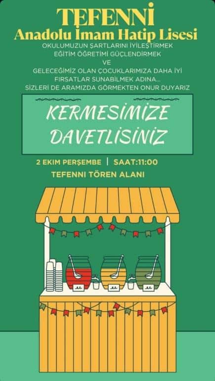 2 EKİM PERŞEMBE GÜNÜ TEFENNİ MEYDANINDA OKULUMUZUN EĞİTİM ÖĞRETİM FAALİYETLERİNİ GÜÇLENDİRME AMAÇLI OKUL KERMESİ DÜZENLEDİK.